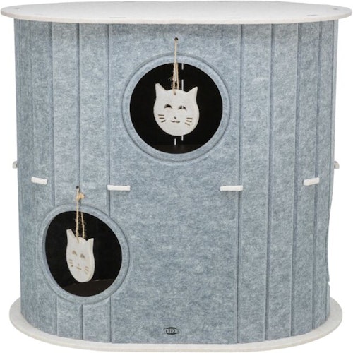 Gemütliche, formstabile Filzhöhle Mara mit 2 Etagen und Spielzeugen für Heimtiere.