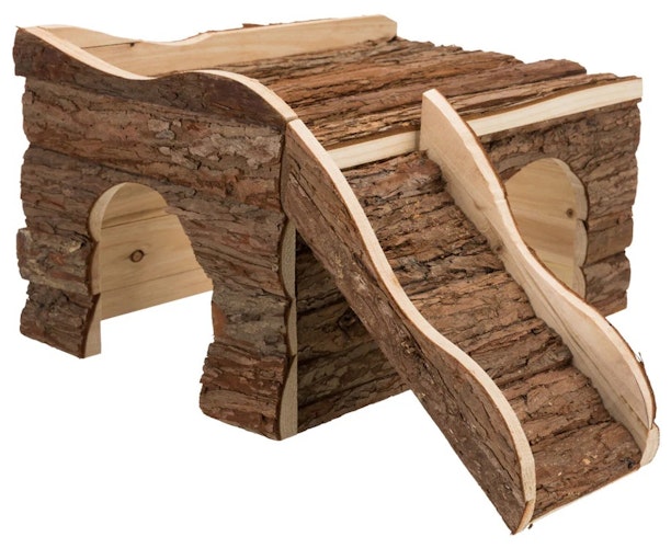TRIXIE bietet ein Haus aus unbehandeltem Rindenholz für Kaninchen und Nager, mit 2 Ausgängen, Rampe und Aussichtsplatz auf dem Dach.