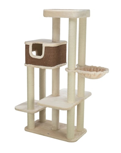 TRIXIE bietet einen 165 cm hohen Kratzbaum für Katzen mit einer gepolsterten Plattform und Höhle, hergestellt aus Plüsch und Sisal in creme/dunkelbraun.